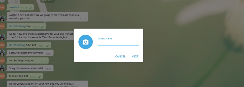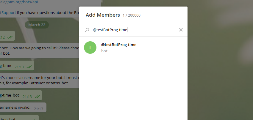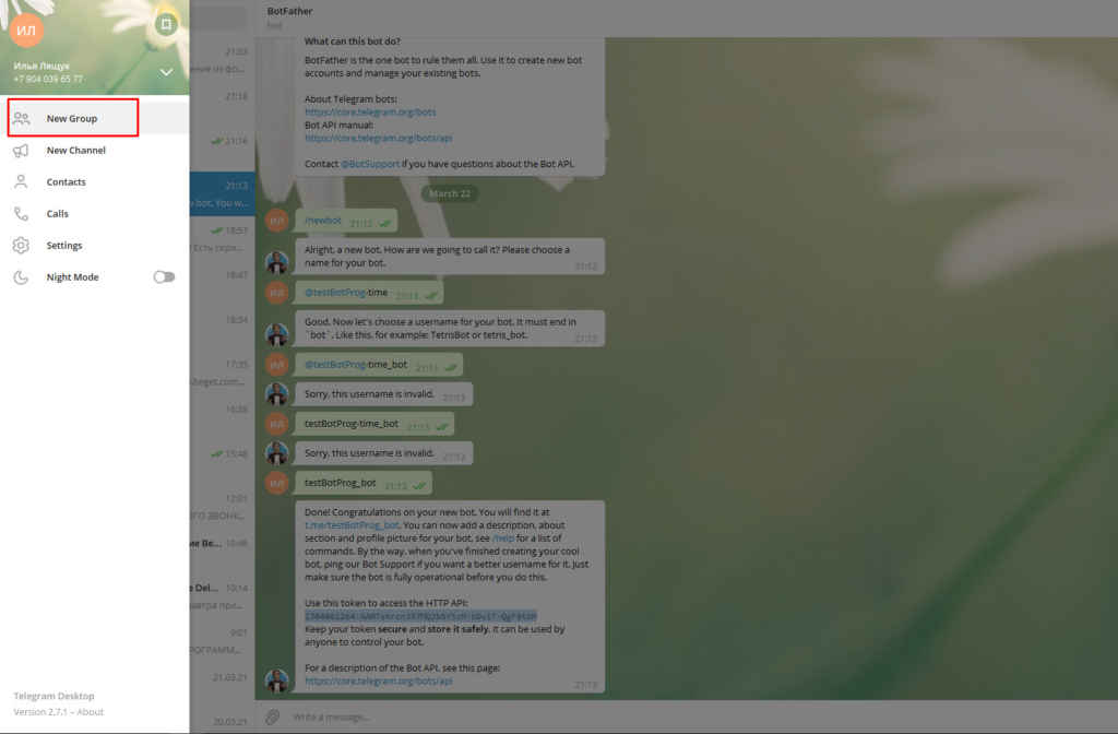 7) Теперь нам нужно создать чат в который мы добавим нашего бота