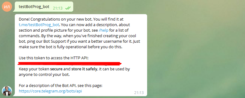 6) После успешной регистрации бота, @BotFather пришлёт вам сообщение с токеном, который вам нужно сохранить, в дальнейшем он нам понадобится.