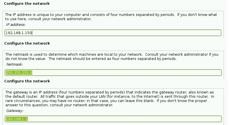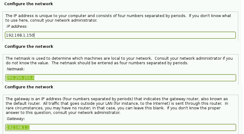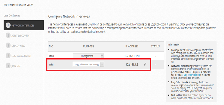 После нажатия на 1-й вариант, другое окно запросит конфигурацию сети, которая показана на рисунке ниже. Мы настроили eth1 для сборщика логов и интерфейса мониторинга сервера OSSIM.