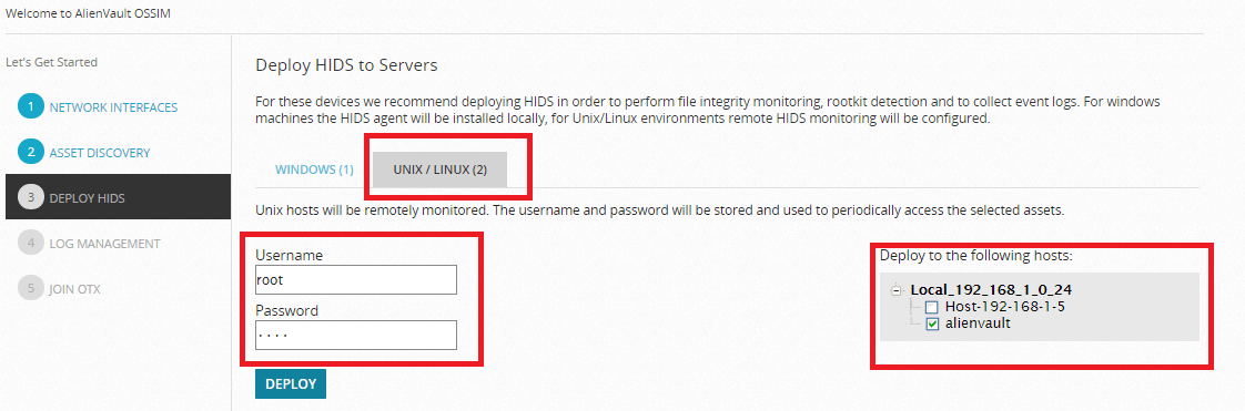 После настройки сети и обнаружения устройств следующим шагом является развертывание HIDS на устройствах Windows/Linux для обеспечения целостности файлов, мониторинга, обнаружения руткитов и сбора логов событий. Введите имя пользователя/пароль устройства для развертывания HIDS.