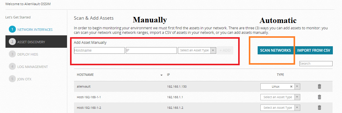 На втором этапе OSSIM выполнит автоматическое обнаружение сетевых устройств. Выберите опцию Обнаружение устройств (2), и следующие окна запросят конфигурацию. Оно поддерживает автоматическое и ручное обнаружение устройств.