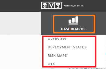 Он показывает полное представление обо всех компонентах сервера OSSIM, таких как серьезность угрозы, уязвимости в сетевом узле, состояние развертывания, карты рисков и статистика OTX. Подменю дашборда показаны на следующем рисунке
