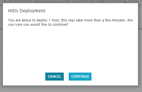 Выберите нужный хост из списка и нажмите кнопку Deploy для развертывания HIDS. Далее нажмите кнопку «Continue», чтобы начать процесс развертывания, который показан на рисунке. Этот процесс займет несколько минут для развертывания HIDS на выбранном хосте.