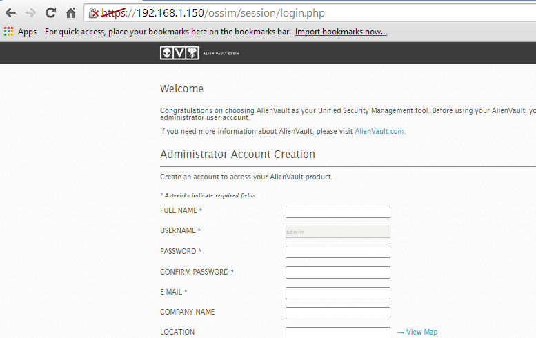 После принятия вышеуказанного исключения, для администратора сервера OSSIM требуется следующая информация. Заполните необходимые данные, которые запрашиваются на следующем рисунке.