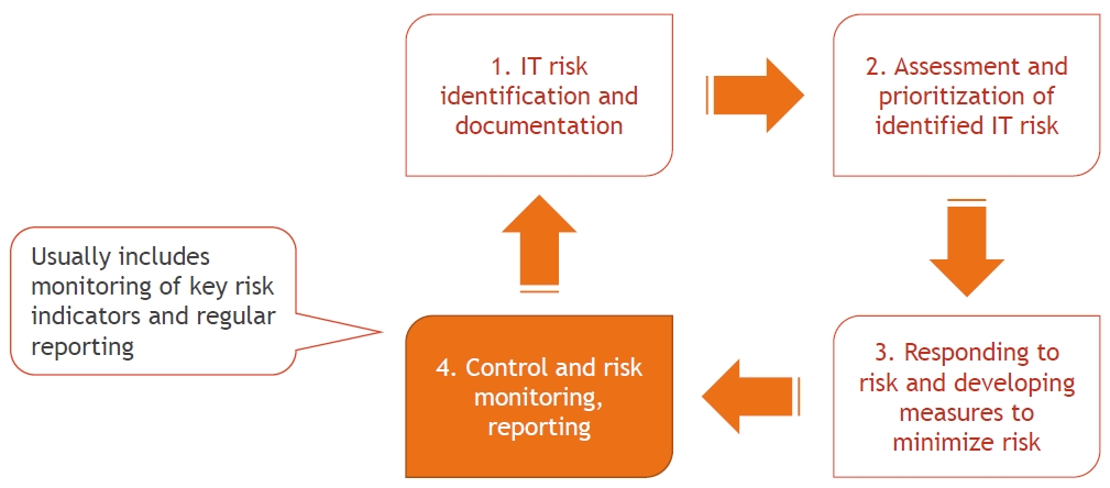 IT risk monitoring includes the development of key risk indicators, monitoring and evaluating the effectiveness of processes and procedures aimed at risk reduction and actualization, updating the risk profile (the list of risks inherent in IT).